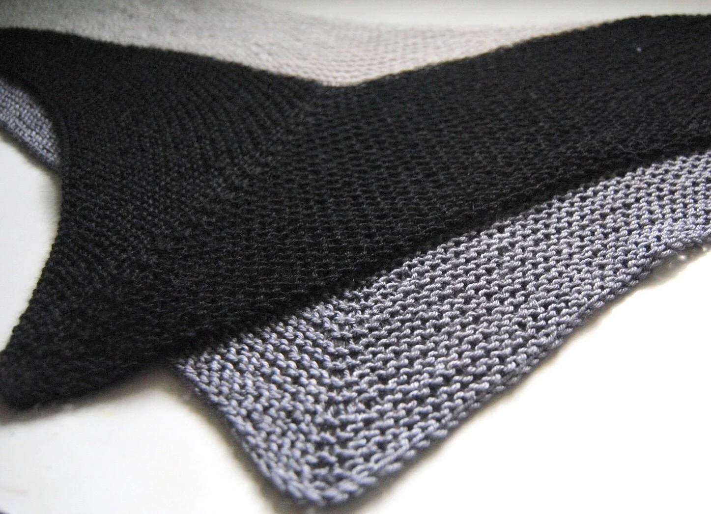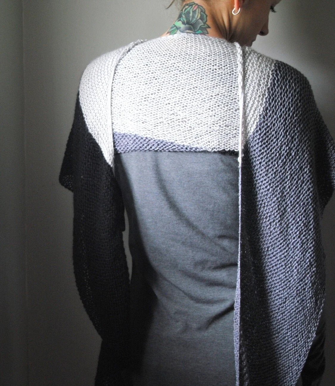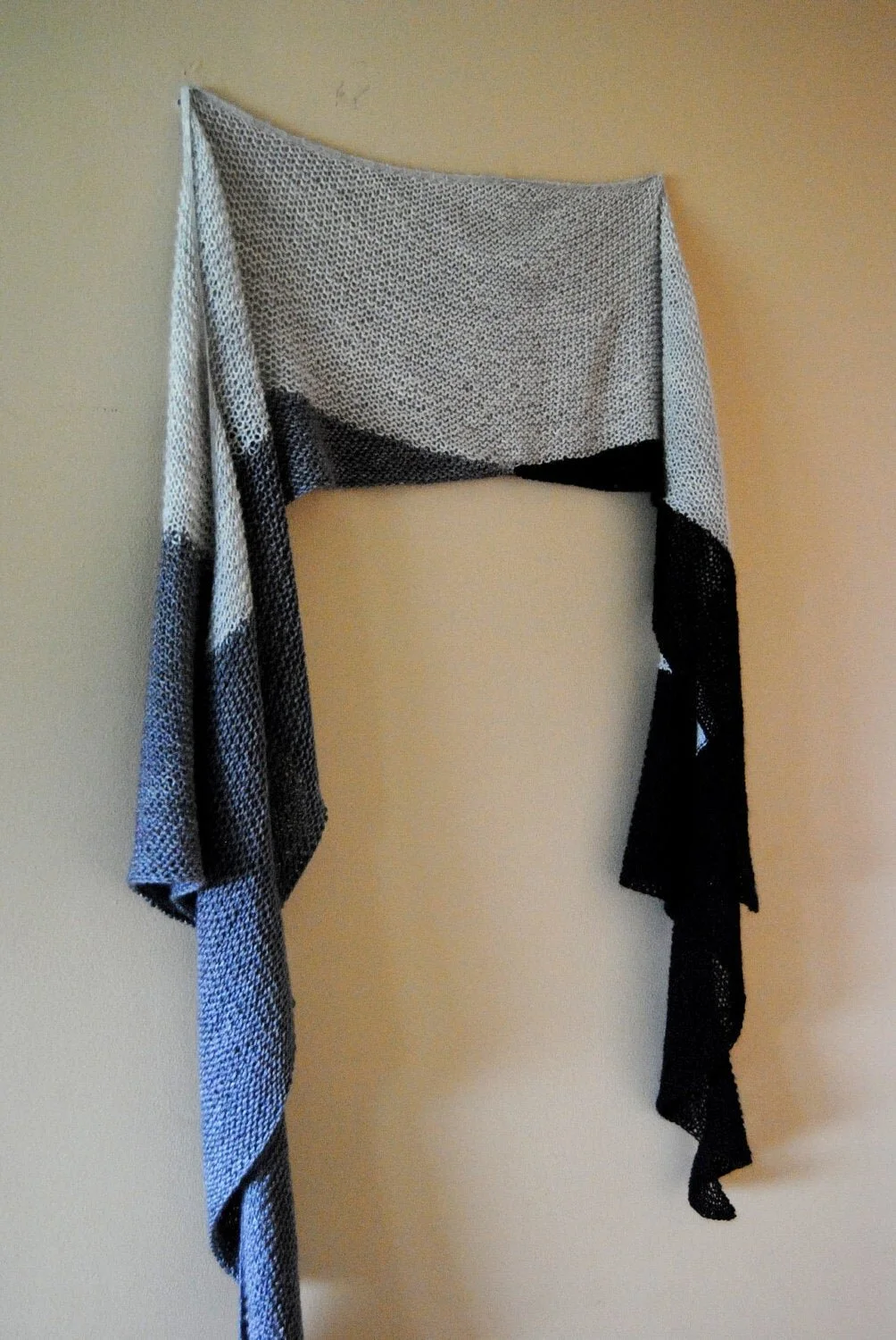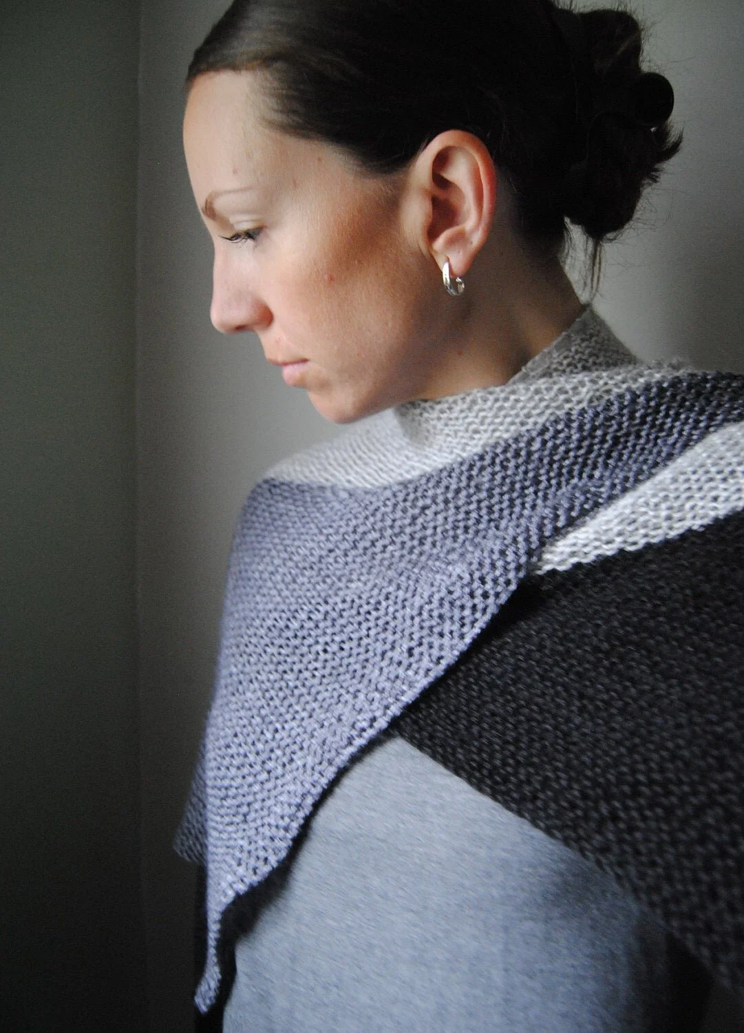 Eris is angular, oversized, drapey and dramatic. Created with short row shaping and three colours, this extra wide shawl can be so many different things, depending on her mood.