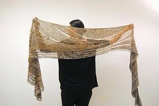 Dropped stitches and short row shaping add extra flair to this extra long garter stitch shawl.