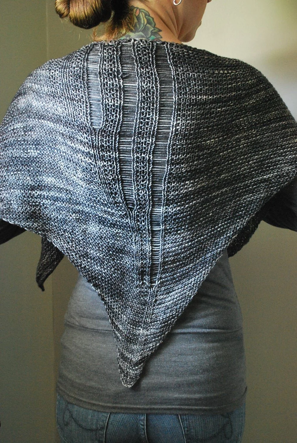 This garter stitch shawl is knit from the bottom point, up and out. A few simple dropped stitches and a bit of asymmetry make it unique.