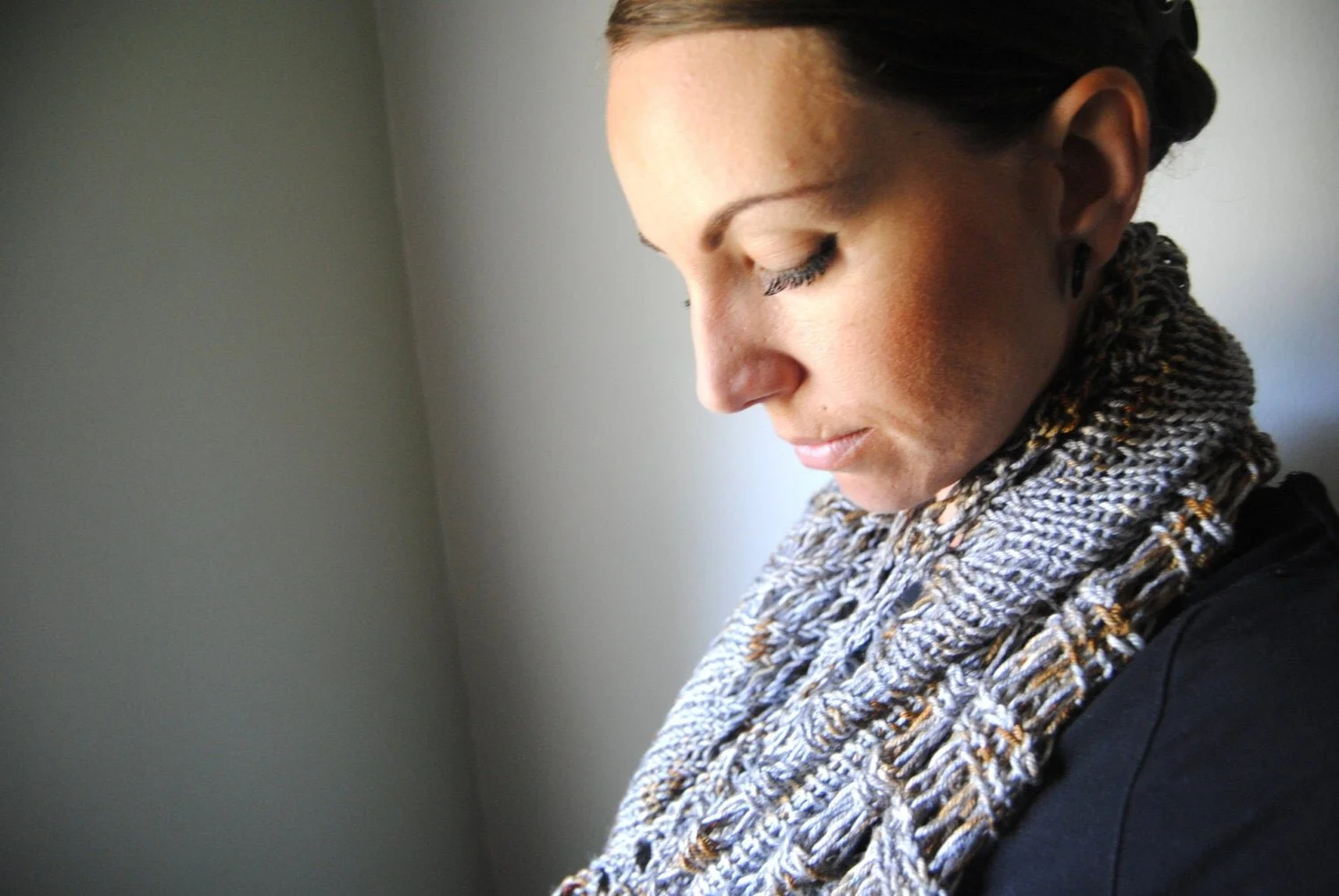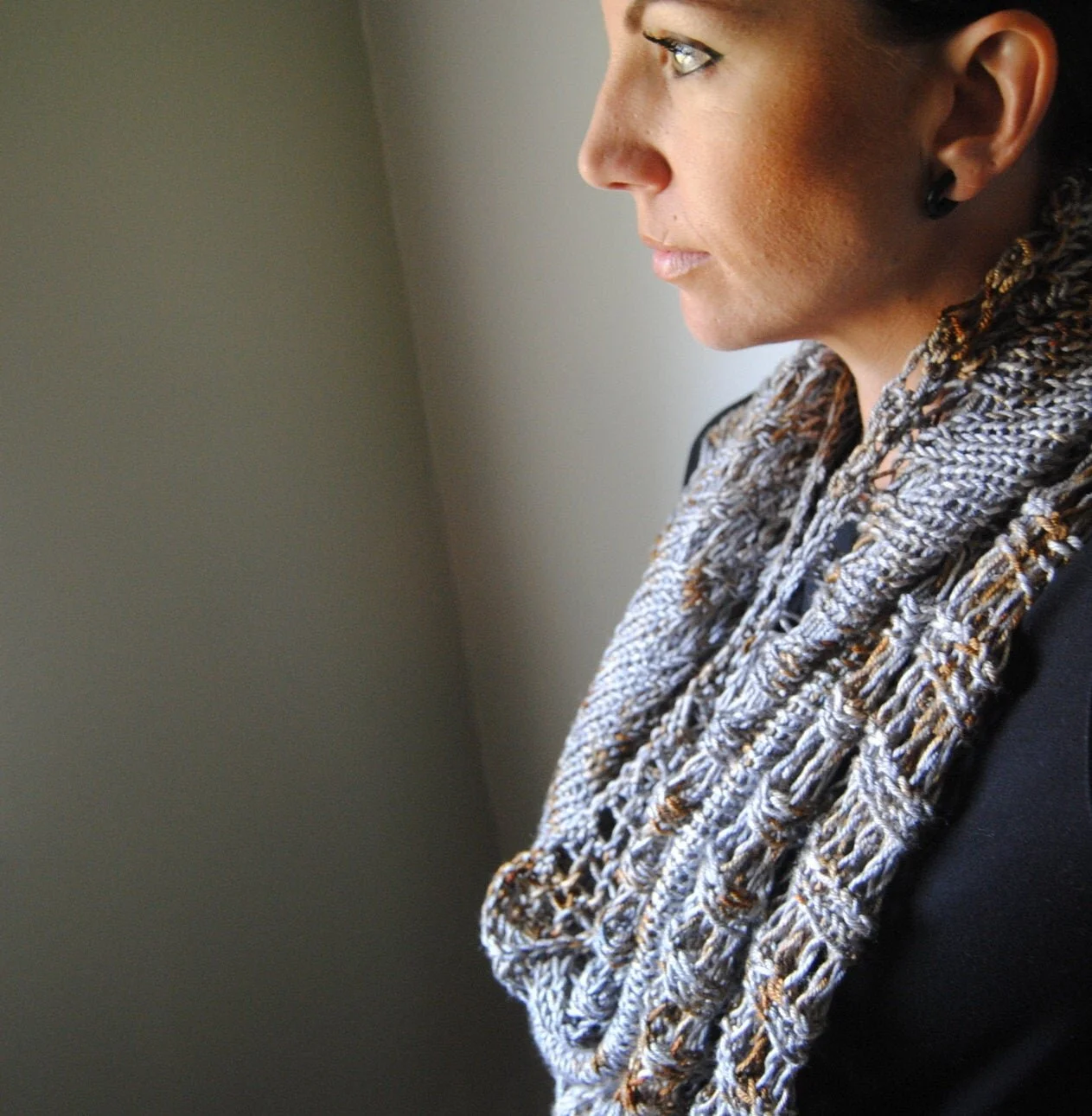 Openwork stitches and a luxurious silk blend yarn create beautiful texture and drape in this dramatic and oversized cowl.