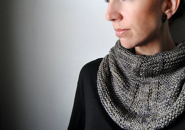 Combining fingering weight yarn, garter stitch and a few stockinette lines to create a simple and modern cowl.