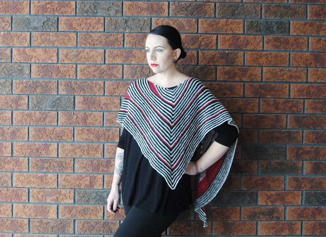 Hypnotic stripes broken up by striking red short row sections make this shawl an alluring accessory.