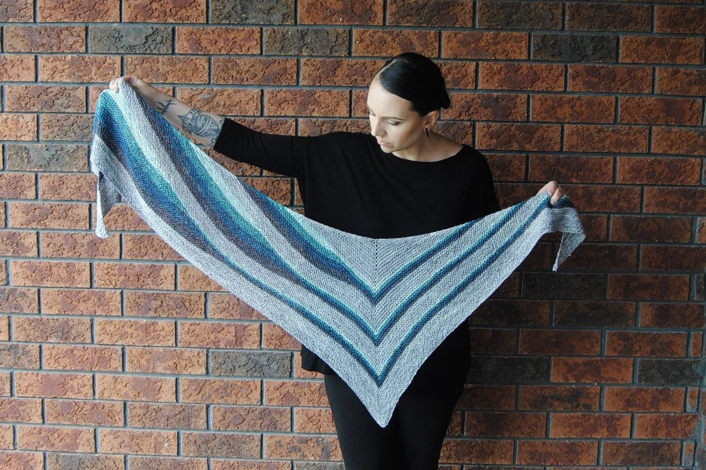 Garter stitch and short row stripes make this asymmetric triangular shawl a fast and fun knit.