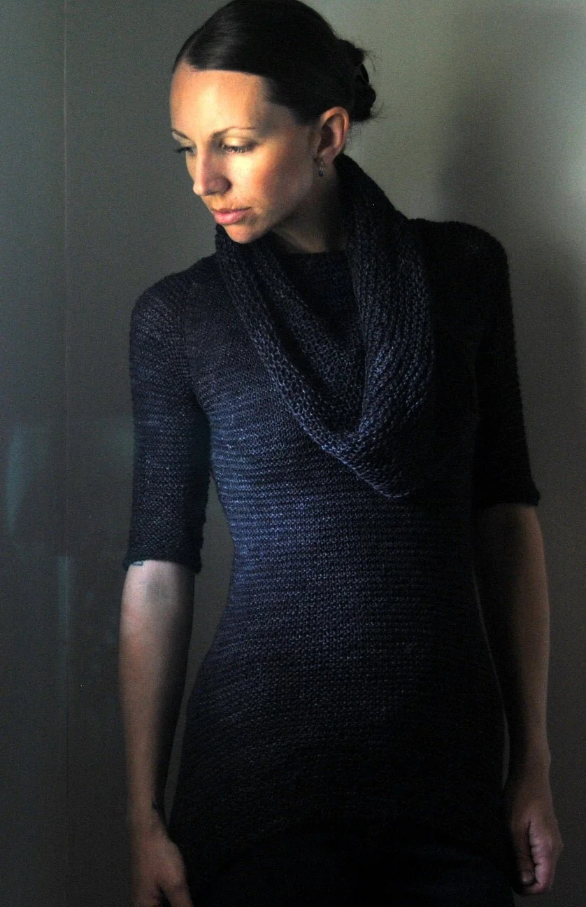 This garter stitch sweater is knit in the round from the top down, using a simple little slip and turn technique, eliminating the need to purl. With it’s dramatic cowl neck and sexy back seam, Obsidian is unique and stylish.