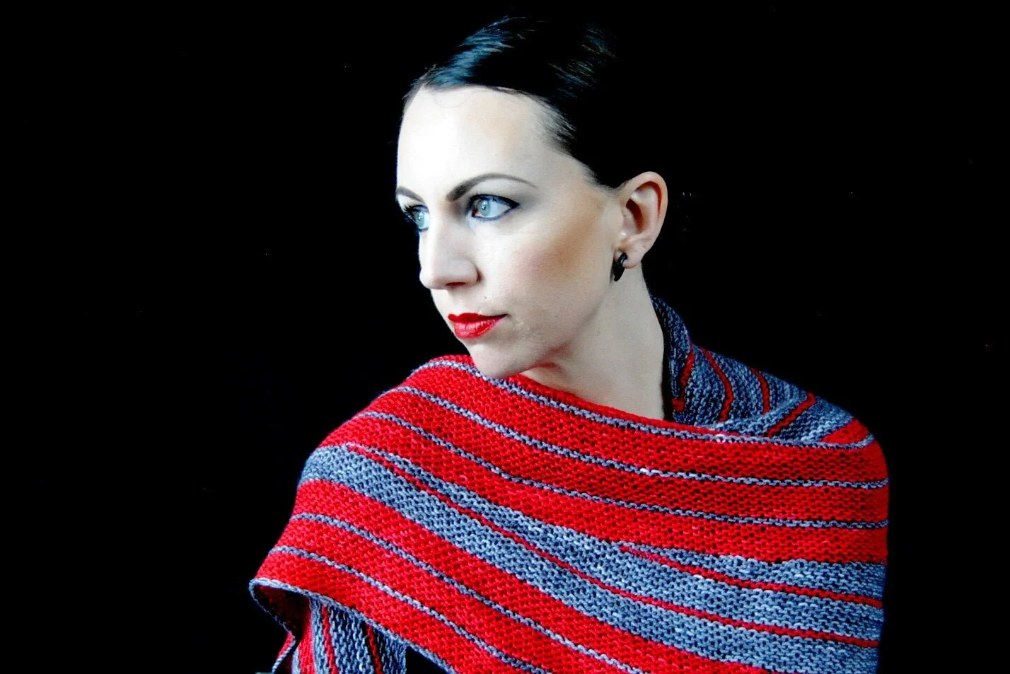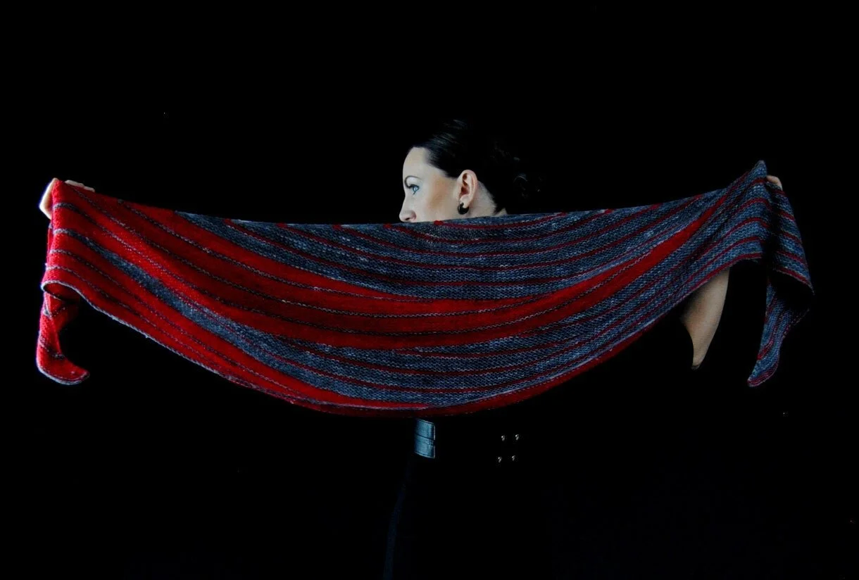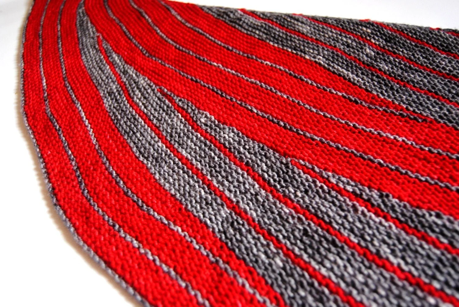 Fiery chases Nocturne, as they race across short-row wedges in this sinuous, semi-circular shawl.