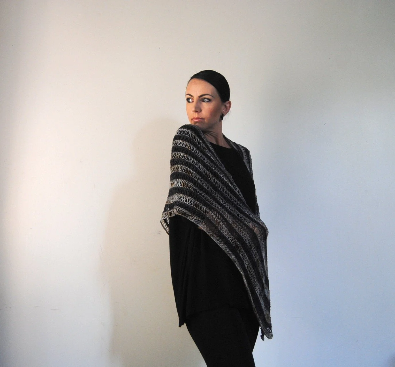 A weblike series of garter stitch and drop stitch stripes knit in 2 colours of hand dyed yarn, Toile is a lightweight triangular shawl, perfect for summer and beyond.