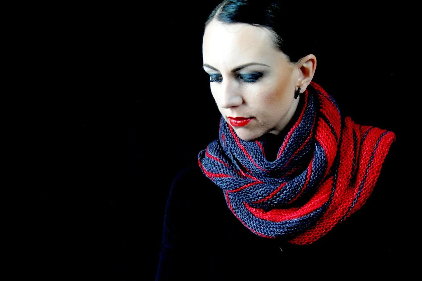 Staggered Midnight triangles envelop Fiery in this dramatically wide, V-shaped shawl.